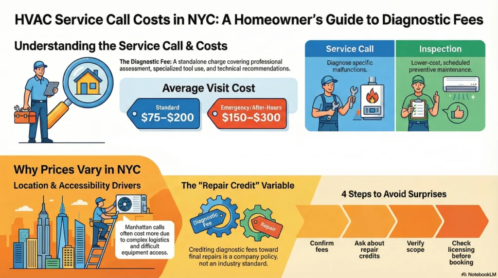 The cost of a service call for HVAC typically covers the technician’s visit and diagnostic assessment. In NYC, this fee is usually higher than in suburban areas due to travel time, building access, and operating costs. The service call does not include repairs unless stated otherwise.