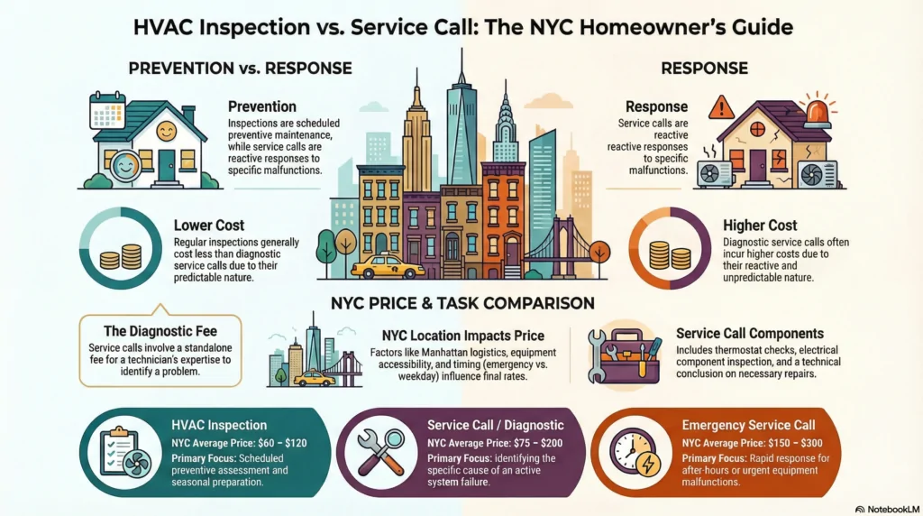 The exact cost of an HVAC service call in NYC varies by provider, system type, and timing of the visit. For residential properties, service call and diagnostic fees commonly fall in the $75–$200 range, while after-hours or emergency visits may cost more.